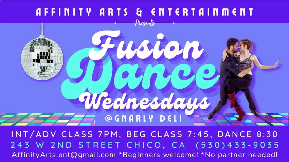 Join us every Wednesday at Gnarly Deli in downtown Chico for Fusion dance classes and social dancing! ???In the dictionary, "Fusion" is the process of joining two or more things into one. In this case, we are combining dances!