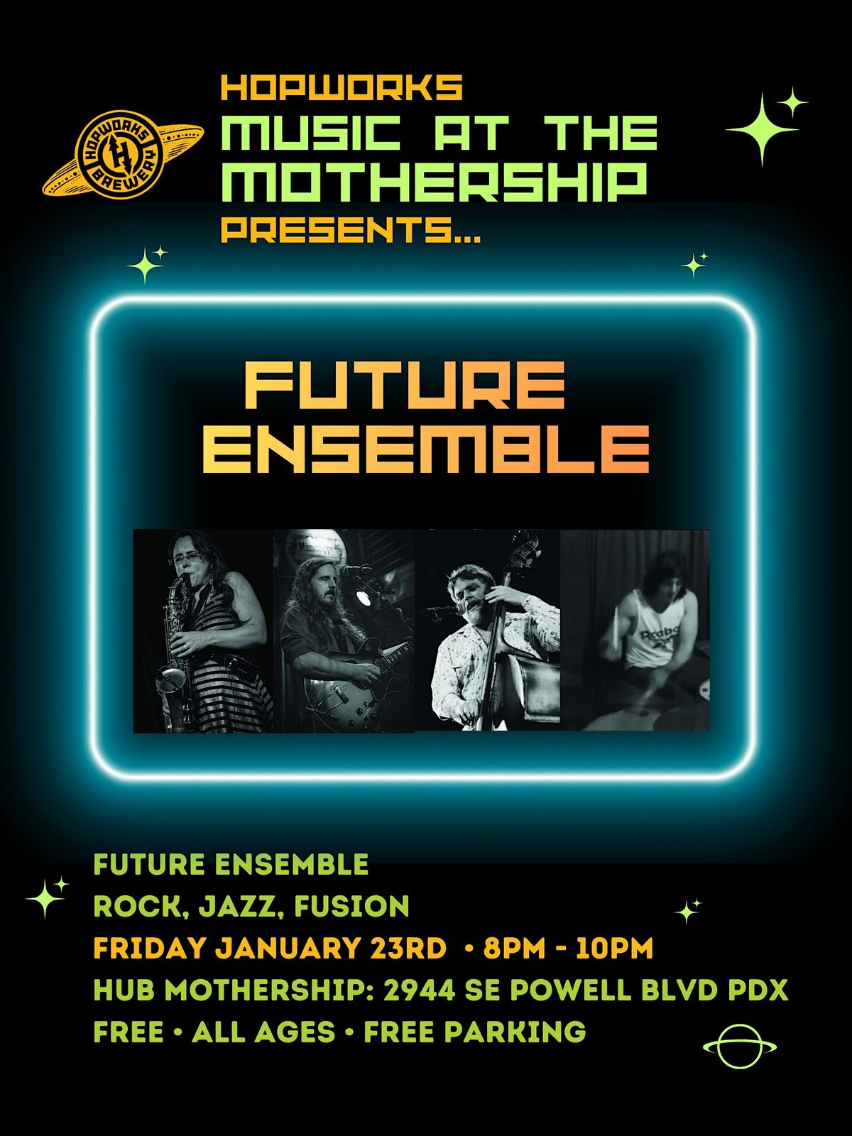 Get ready for an unforgettable night of rock, jazz, and fusion as Future Ensemble lights up the stage! Don’t miss out, grab your friends and join us for an incredible evening of music!