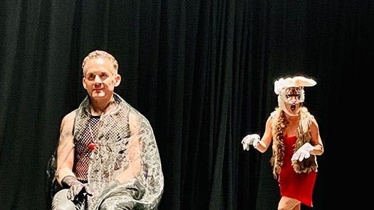Burning splices laboratory-theatre rigour with the subversive wit of cabaret and burlesque: score-driven training meets glitter and lip-sync; gestures repeat, mutate and fracture; songs are cut with testimony as a choreography of violence and tenderness takes shape. In this volatile duet, bodies refuse easy legibility—queering divinity, gender and mortality—while the audience becomes accomplice to a theatrical game of cat and mouse.