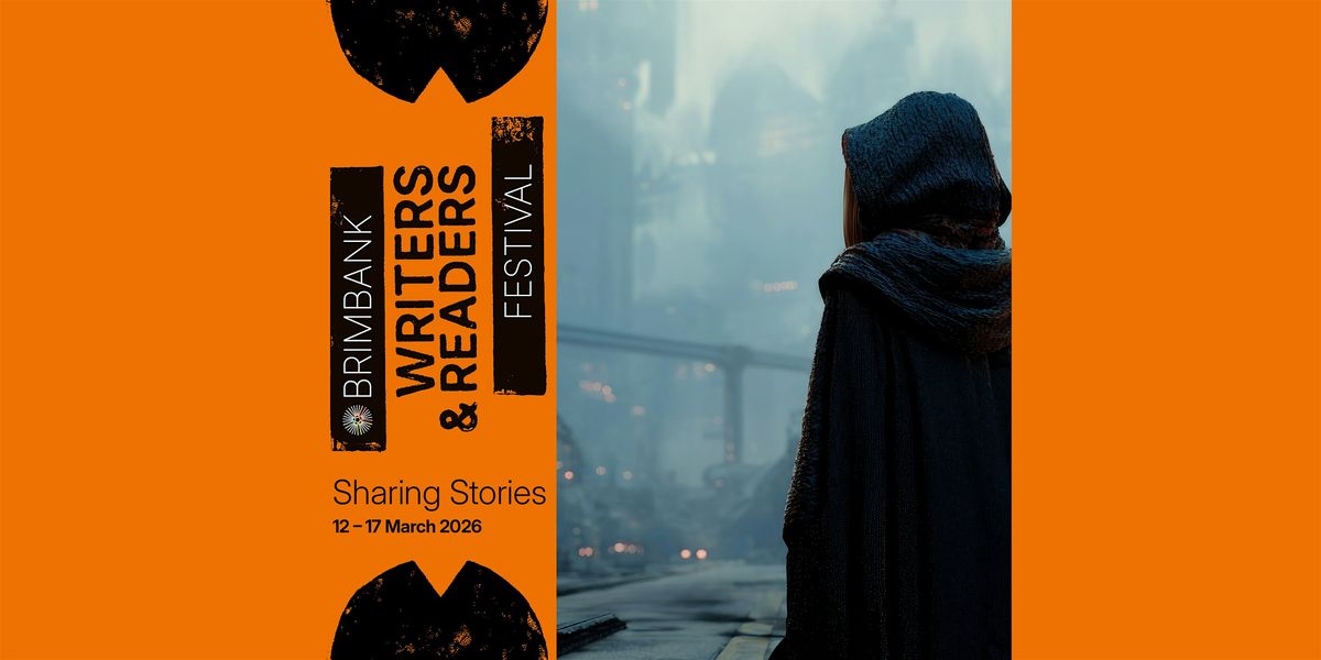 [ Image description 1: Cloaked figure viewed from behind looking out over a futuristic setting. Text reads Brimbank Writers & Readers Festival, Sharing Stories 12-17 March 2026]