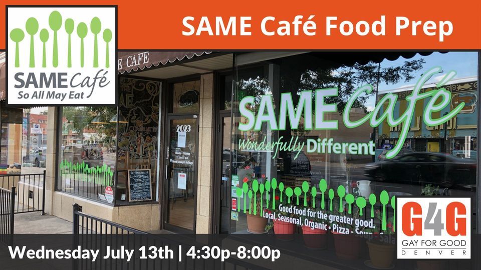 REGISTER HERE: https://gayforgood.org/events/g4g-denver-same-cafe-july-13/Gather in community with the fabulous people of SAME Café, a pay-what-you-will community café that serves organic, healthy, and (trust us we’ve tried it) delicious food! G4G is teaming up with SAME to help with food prep for a special event with their community partner, the Denver Botanical Gardens.