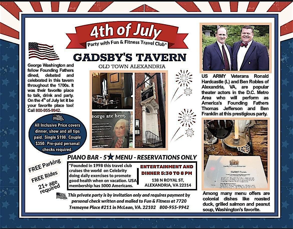 Festivities will be from 5:30 to 8:00 PM on July4th! and include a seated dinner with brief musical and speaking presentations. Dress is country club chic ~ or colonial costumes. You decide! Thomas Jefferson and Ben Franklin will come to pay their respects as well.