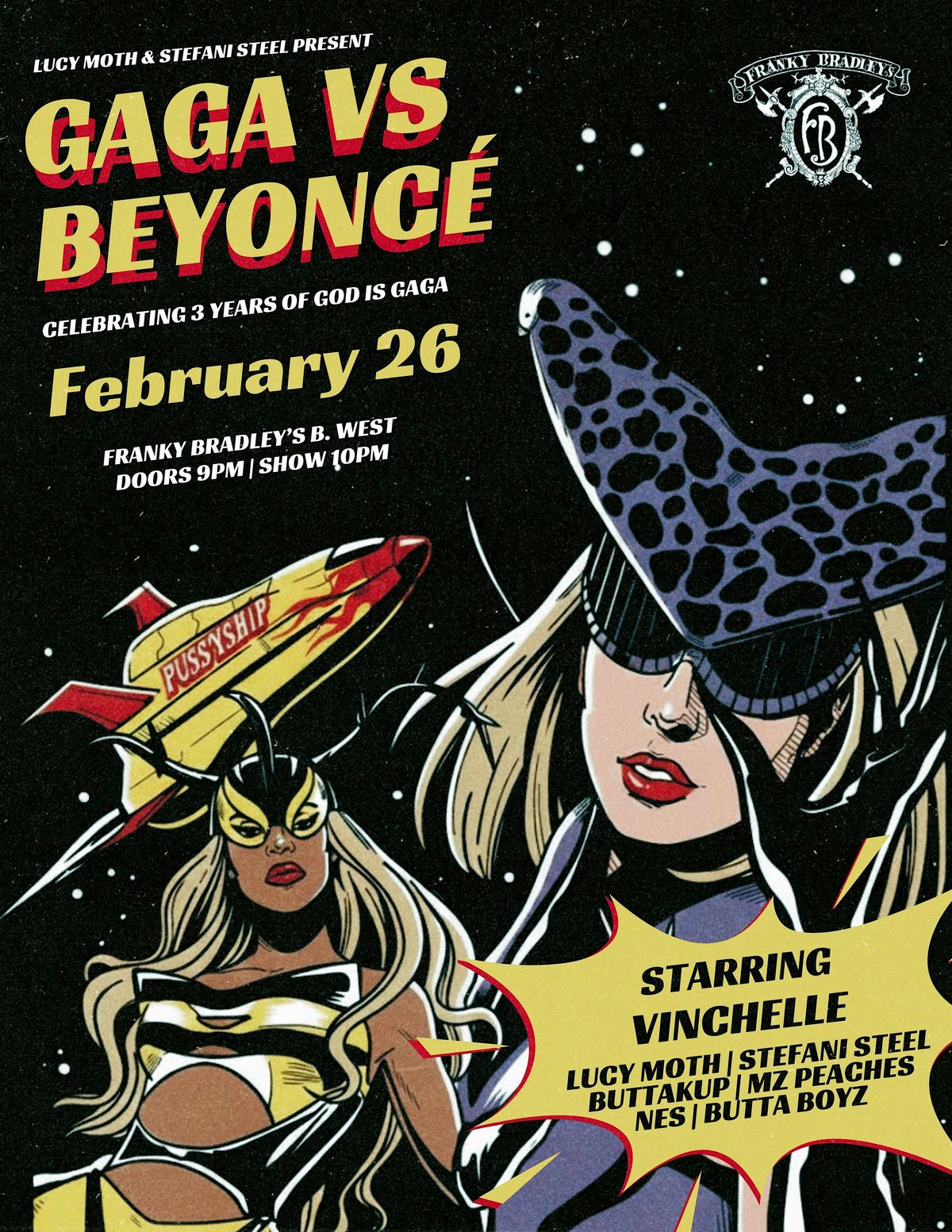 Celebrating 3 years of God is Gaga, Lucy Moth presents Gaga vs. Beyoncé, a drag tribute show to the queens of pop, featuring your favorite hits, starring Stefani Steel, VinChelle, Mz Peaches, Buttakup, and Nes. Beats by Droo Trax.