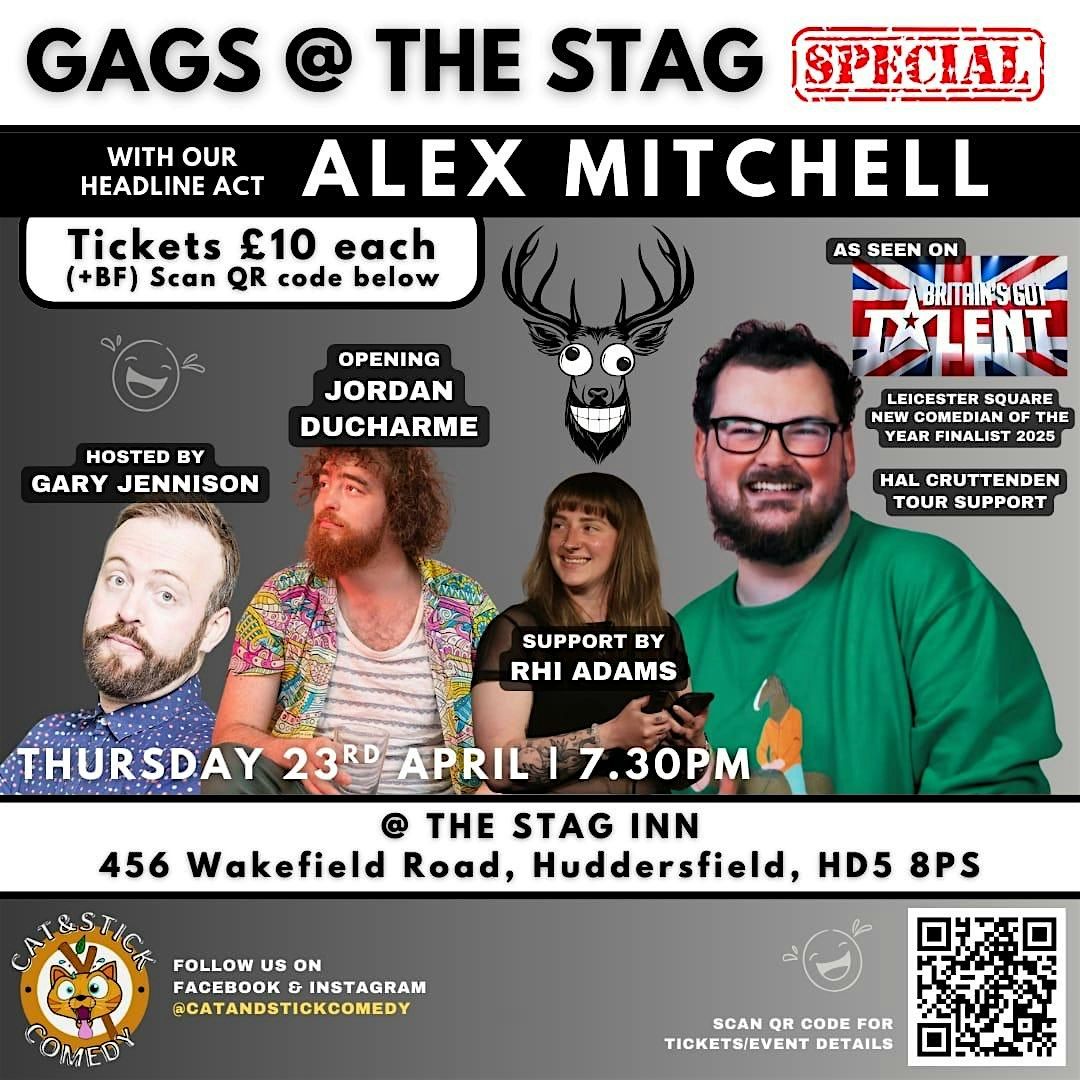 Get ready for an epic night of laughs at the Gags @ The Stag Special featuring Gary Jennison as your host with Jordan Ducharme opening followed by Rhy Adam's then our Headline act the hilarious Alex Mitchell! Join us in person for a cracking comedy session that'll have you rolling in the aisles. Bring your mates, grab a drink, and enjoy some top-notch stand-up in a cozy, fun atmosphere. Don’t miss out on this unforgettable night of pure comedy gold!