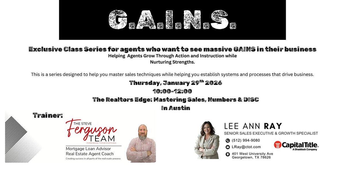 This hands-on G.A.I.N.S. class will help you understand your sales numbers, activity patterns, and DISC profile so you can make smarter decisions, increase consistency, and grow with intention in 2026.