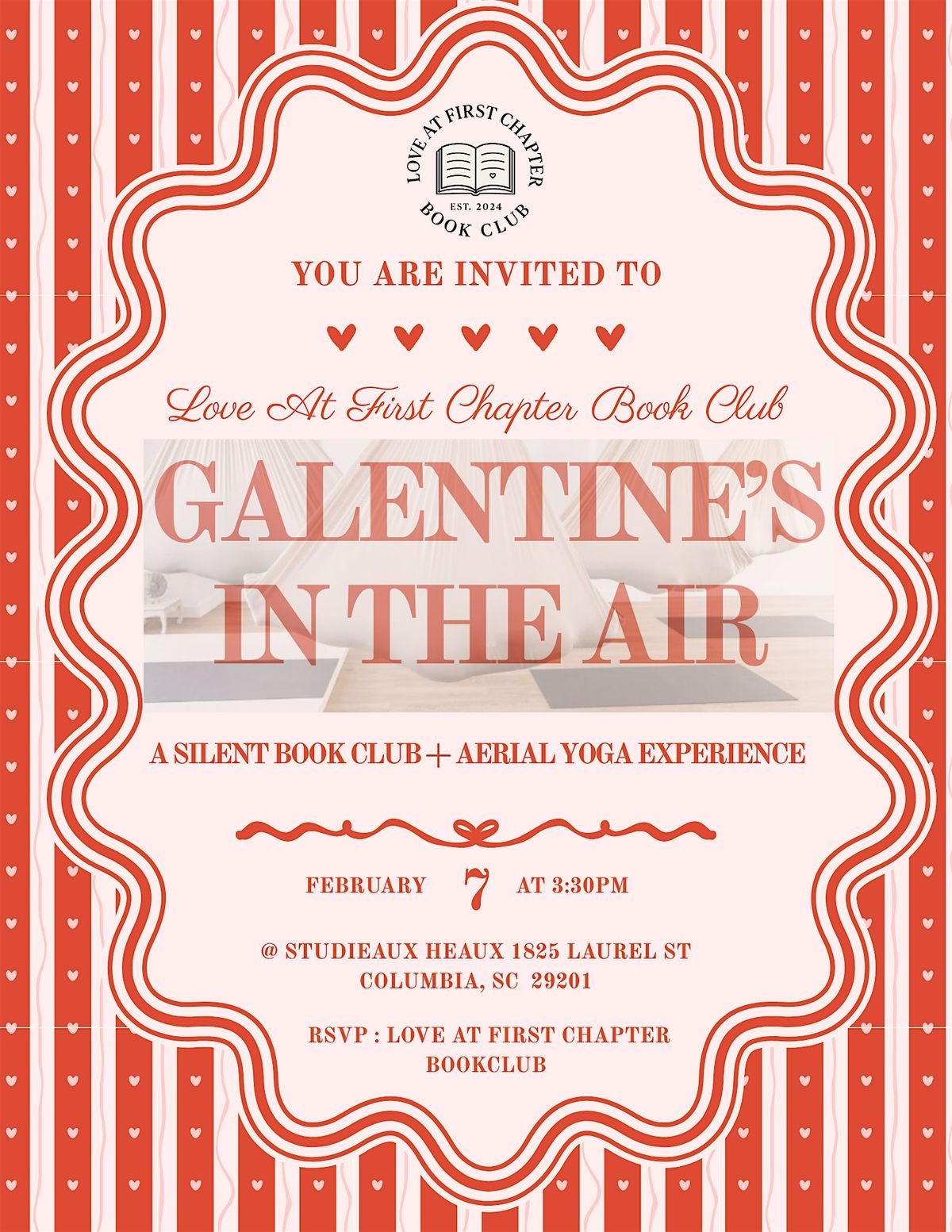 Join Love at First Chapter Book Club for a one of a kind Galentine’s experience that blends storytelling and movement. Galentines In The Air is a guided silent book club paired with aerial yoga. During this experience, guests will listen to a shared read aloud while being guided through gentle, beginner friendly aerial yoga movements.