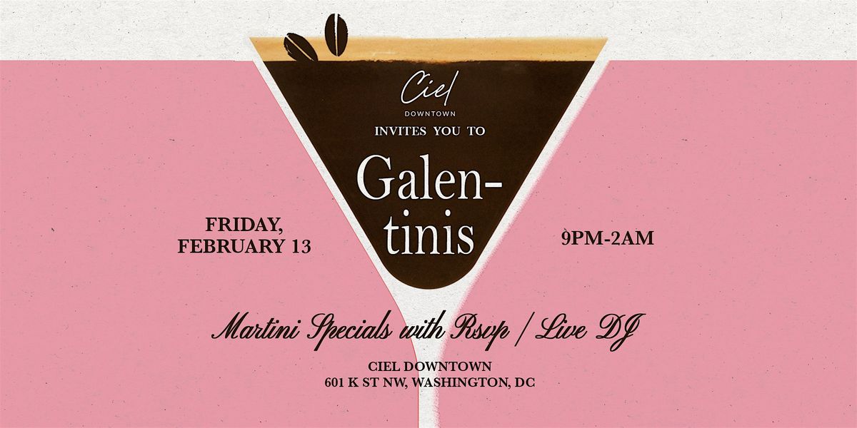 It's Galen-tinis Day at Ciel Downtown! Enjoy a custom Valentines themed martini menu with deals on espresso, dirty and lychee martinis all night. Dance to our live DJ fromt 9pm and until close.