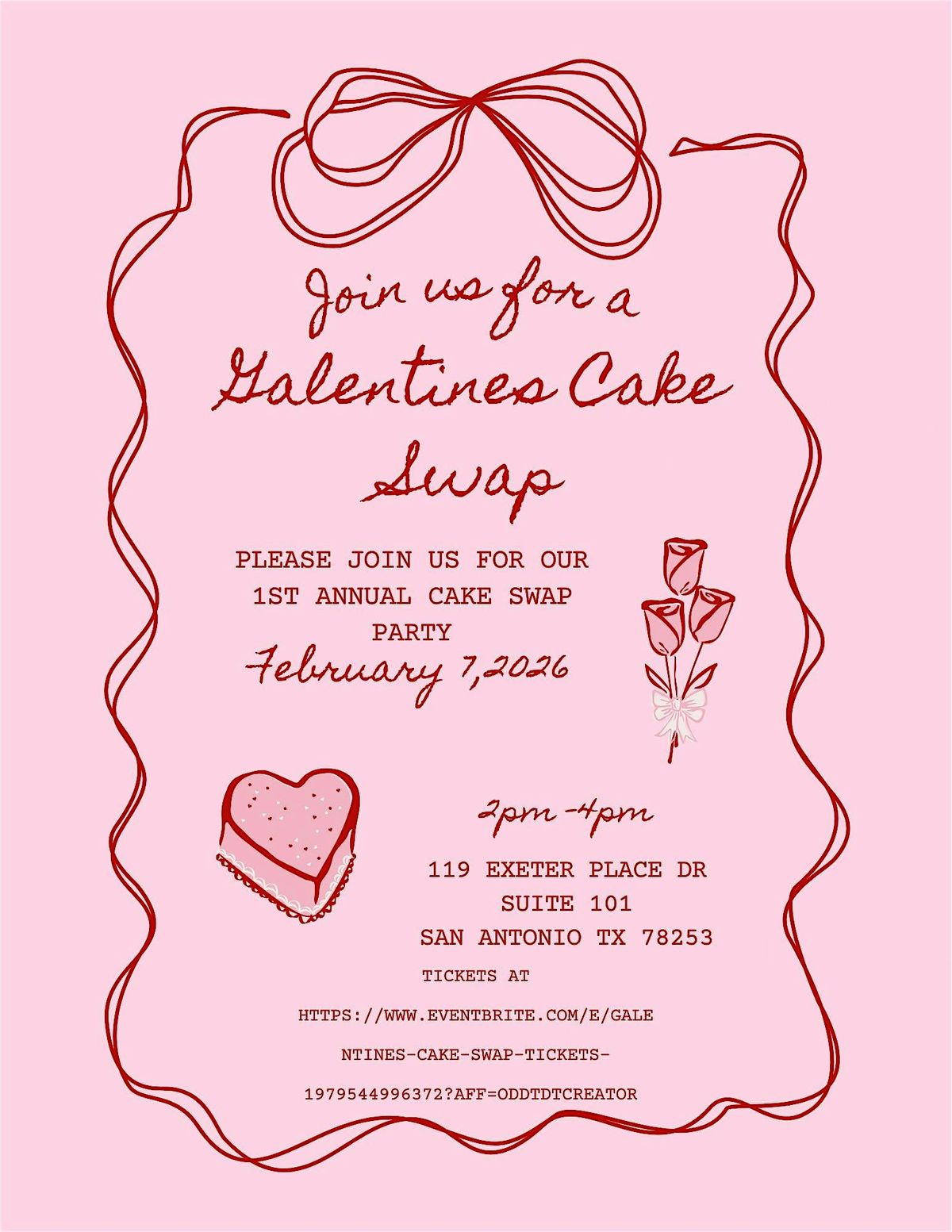 Welcome to the Galentines Cake Swap happening at Adrenaline Dance & Performing Arts Studio on February 7, 2026 at 2:00 PM (Central Time)! 🍰🎉