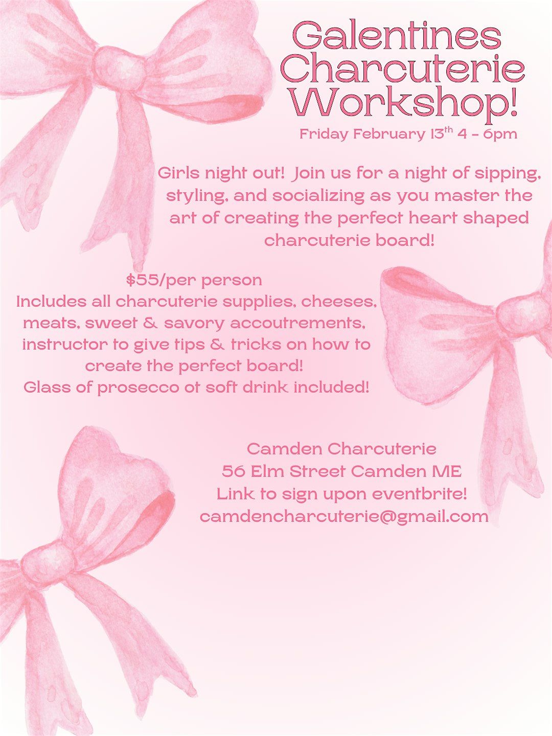 Come join us at Camden Charcuterie on February 13, 2026 at 4PM-6PM for a for a fun hands-on experience with your gals ! Learn all the tips and tricks on how to create the perfect heart shaped charcuterie board! We'll provide all the ingredients and guidance you need. No experience necessary - See you there!