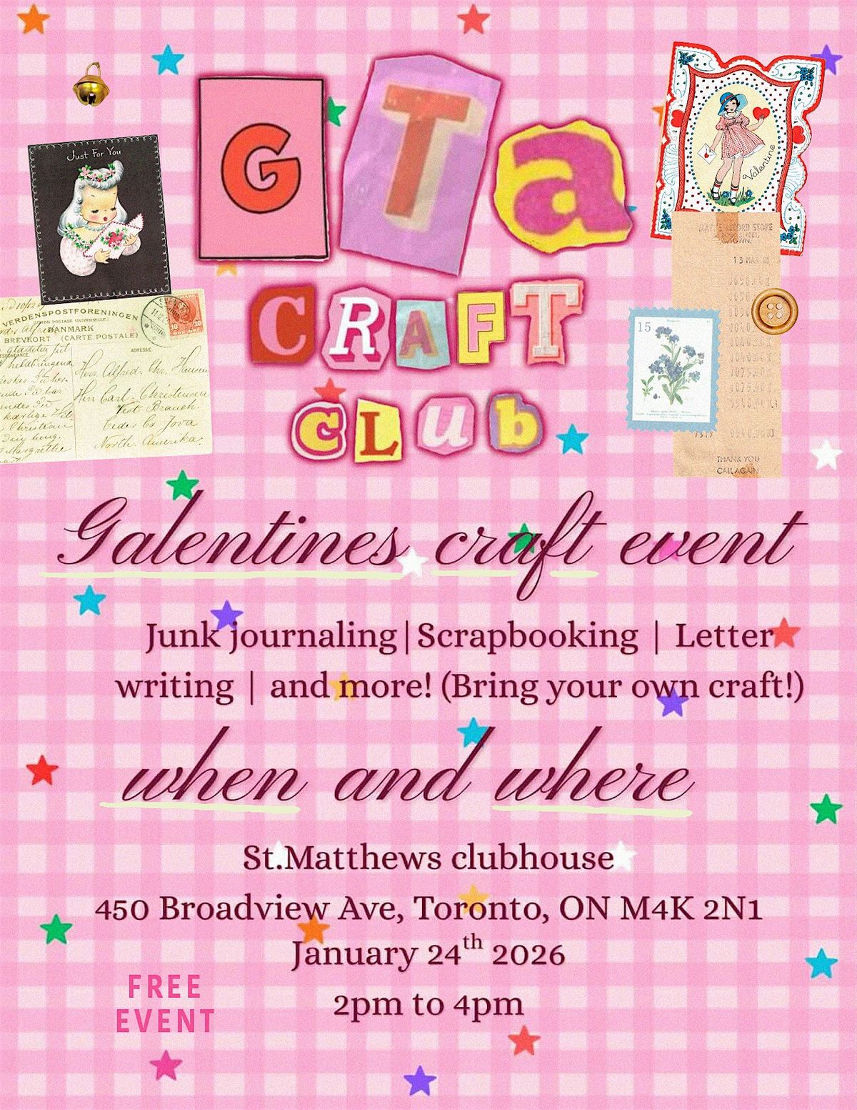 Grab your junk journals and join us for our first FREE in person crafting event in Toronto. GTA Craft Club’s focus is to build community over the shared love of crafting, while sharing space and creativity together. Grab your crafty Gal pals and gays and celebrate Galentines Day with us!! This is a bring your own craft event! The space is accessible, including an accessible washroom. If ASL interpreters are required, or there are other access needs please DM us (@gtacraftclub)!! TheGTA Craft Club will be having regular get togethers in Toronto so be sure to follow us on Instagram for more updates!! This is only the beginning of our beautiful crafty community.