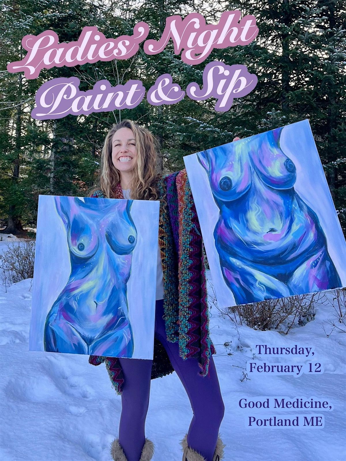 Erica will have two example paintings with different body types, and will paint a third while guiding you through the process of your own. Participants are encouraged to paint whatever body shape/size resonates with them, and Erica will offer guidance to lead us through our own expressions of the female form. We will build the figures and then add bold swipes of color and juicy highlights to bring our ladies to life. Our number one goal is to be inclusive and celebratory of all body types, and create a safe space to tap into our creativity.