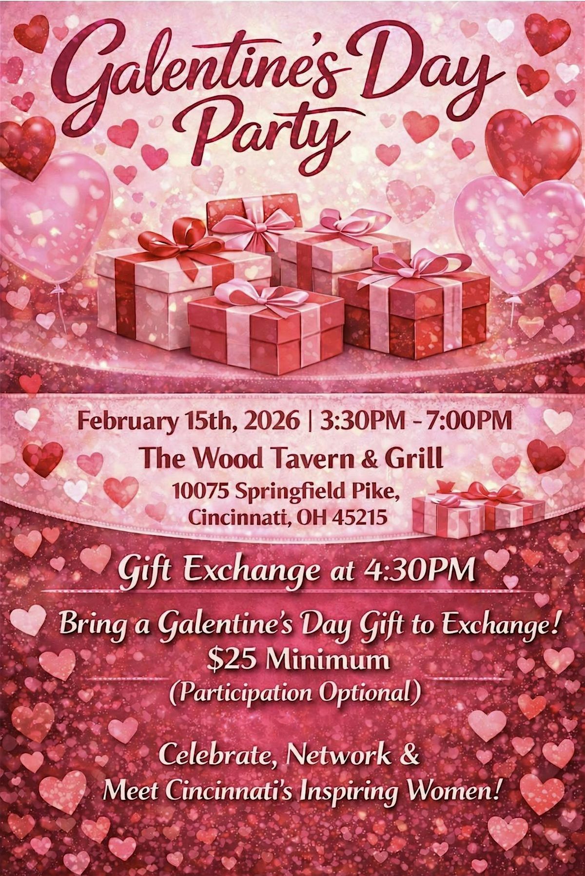 Guests are invited to participate in an optional Galentine’s Day gift exchange with a minimum value of $25.00, taking place promptly at 4:30 PM. Participation is completely optional, and all are welcome to attend and enjoy the event regardless.