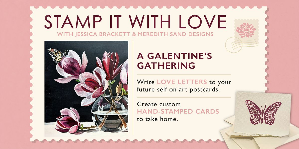 Join us for an intimate gathering inspired by Emergence and the spirit of Galentine’s. Guests will write notes to themselves, friends, or loved ones using postcards featuring Jessica Brackett’s artwork, then select custom stamps for hand-stamped cards by Meredith to take home. Put your words to paper now, and receive your postcards back in the mail later in the year as a meaningful reminder.