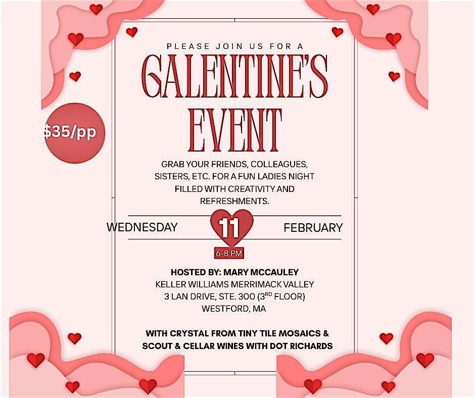 đź’—Happy Galentine's Day! Treat yourself & your friends to a night out to enjoy some great company, a mosaic craft, wine, charcuterie & sweet treats. Let's celebrate Ladies! đź’—