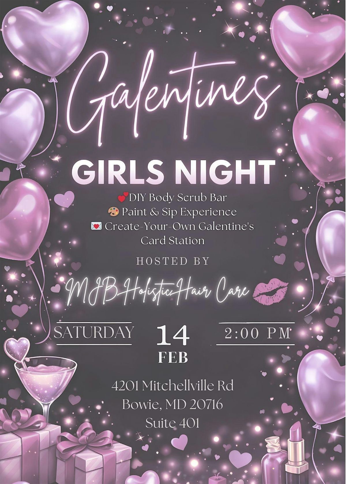 Join us for a fun and creative Galentine’s experience designed to celebrate friendship, self-care, and creativity. Guests will enjoy a guided Paint & Sip session and a hands-on DIY Body Scrub experience, with a complimentary create-your-own card station available throughout the event.