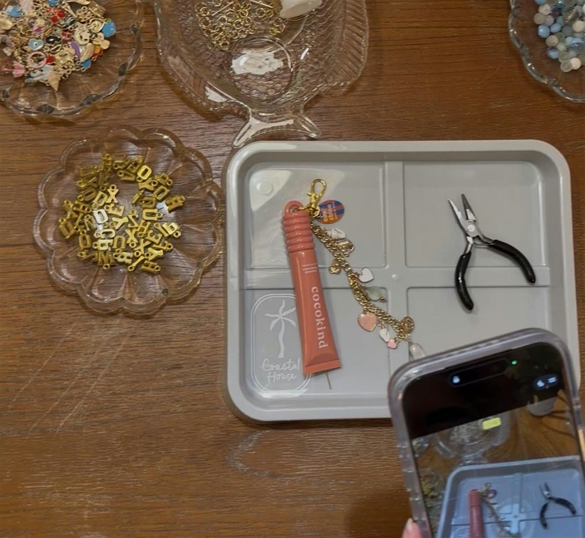 - All supplies to create one lip gloss charm - gold keychain closure, gold chain, charms (letters, shells, beads, etc) + an original A Bit of the Beach charm