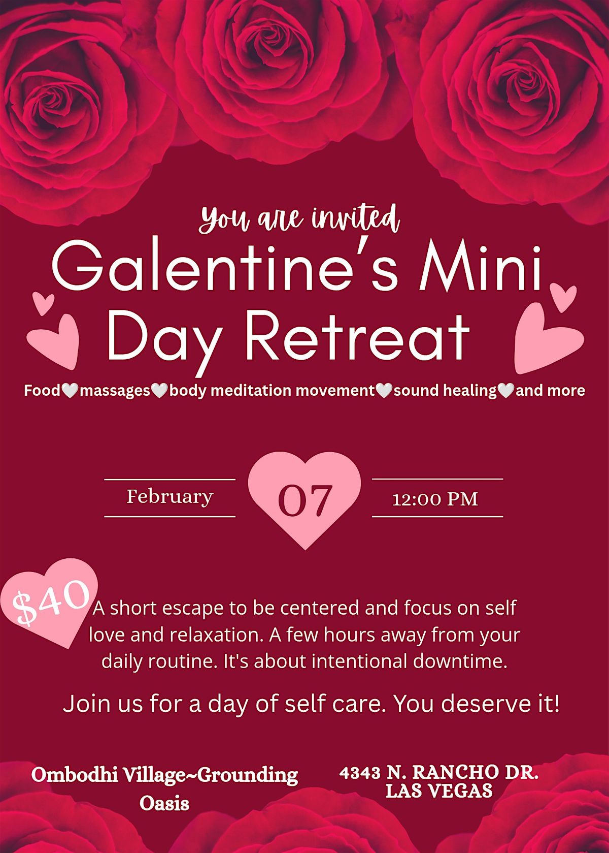 Welcome to BodyGoodness ByJanell Galentine's Mini Day Retreat. Get ready for a day full of relaxing activities. The day is all about you. Let go of your busy daily routine for one day and focus on self love, self care and enjoying yourself. The day will include massages, sound healing, body movement, food and handmade juice, in a room full of beautiful women. Mark your calendars to be sure not to miss a Galentine's full of beautiful memories.