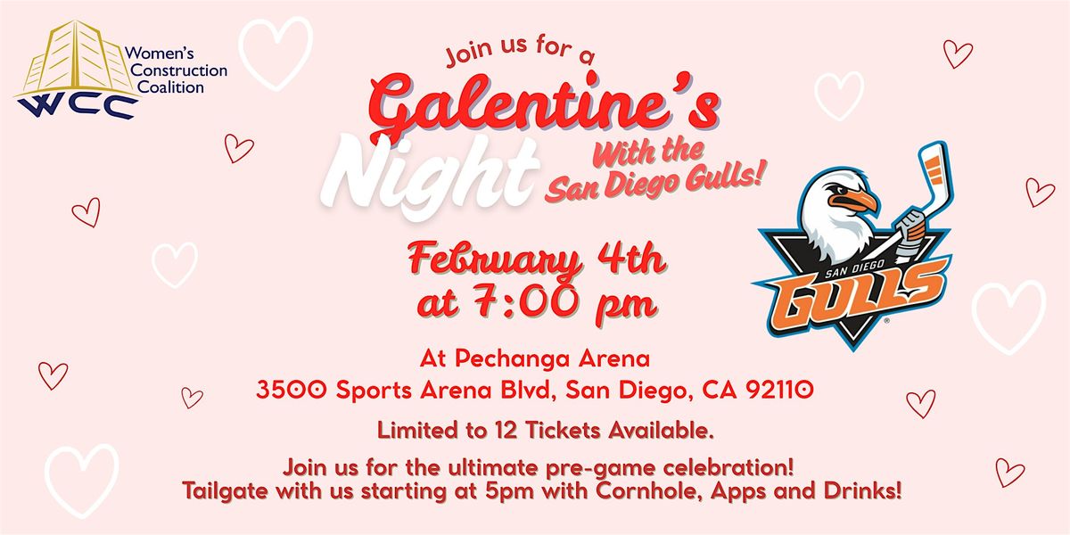 Grab your gals and join us for a night of hockey, connection, and fun as the San Diego Gulls take on the Henderson Silver Knights at Pechanga Arena! We’ll kick things off with a 5:00 PM tailgate in the parking lot—complete with cornhole, drinks, and apps—before heading inside for the 7:00 PM game.