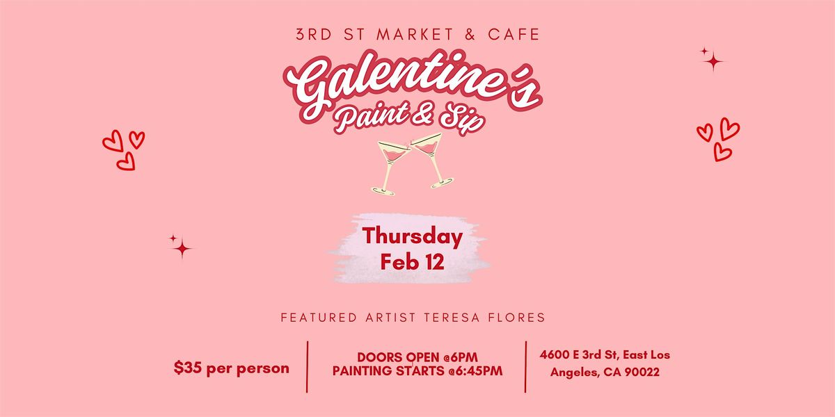 Join us for our first Galentine’s Paint & Sip at 3rd St Market & Deli! Celebrate creativity and good vibes with a guided painting session led by local artist Teresa Flores, plus wine, snacks, and sweets!