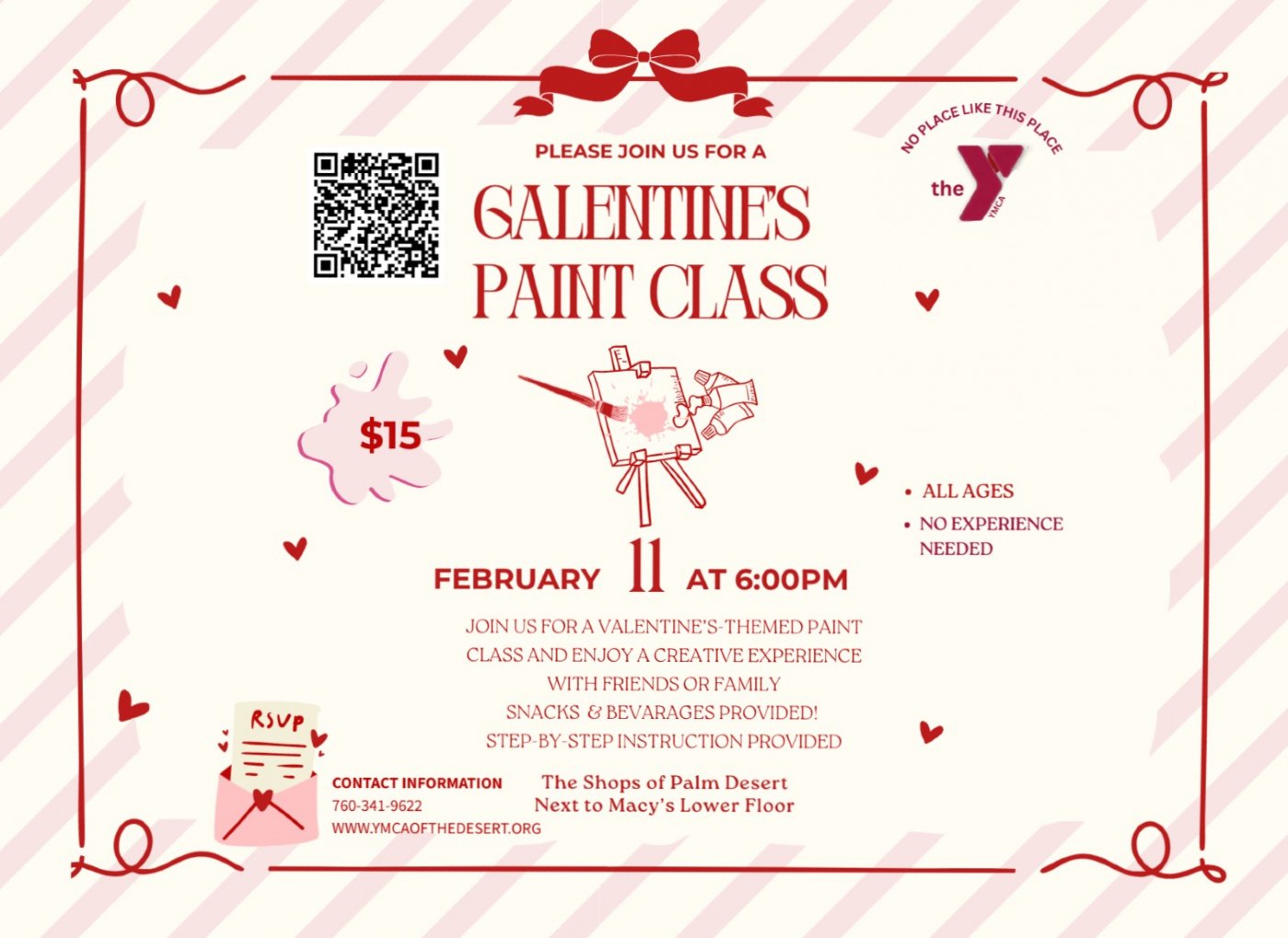 Join us for a Valentine's-themed paint class! Meet new faces and bring a sister, friend, daughter, or son for a fun and creative experience. You'll leave with a finished piece of art you'll be proud to display. All ages welcome. No experience needed!