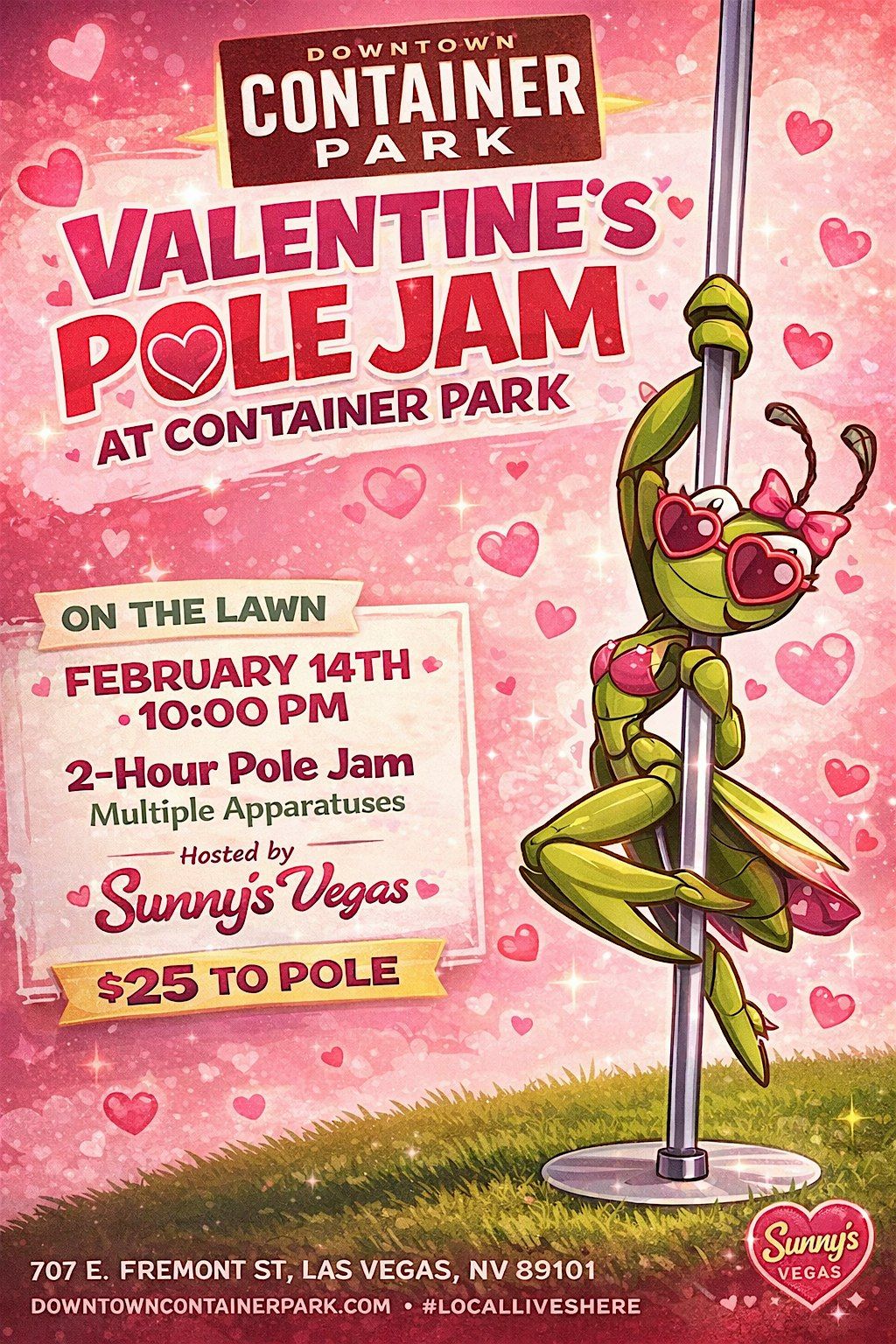 Celebrate love, friendship, and femininity under the lights of Downtown Las Vegas! Join Sunny’s Vegas on the Container Park lawn for a special Valentine’s Night Pole Jam—a playful, empowering outdoor flow session with multiple poles and apparatuses set up for all levels.