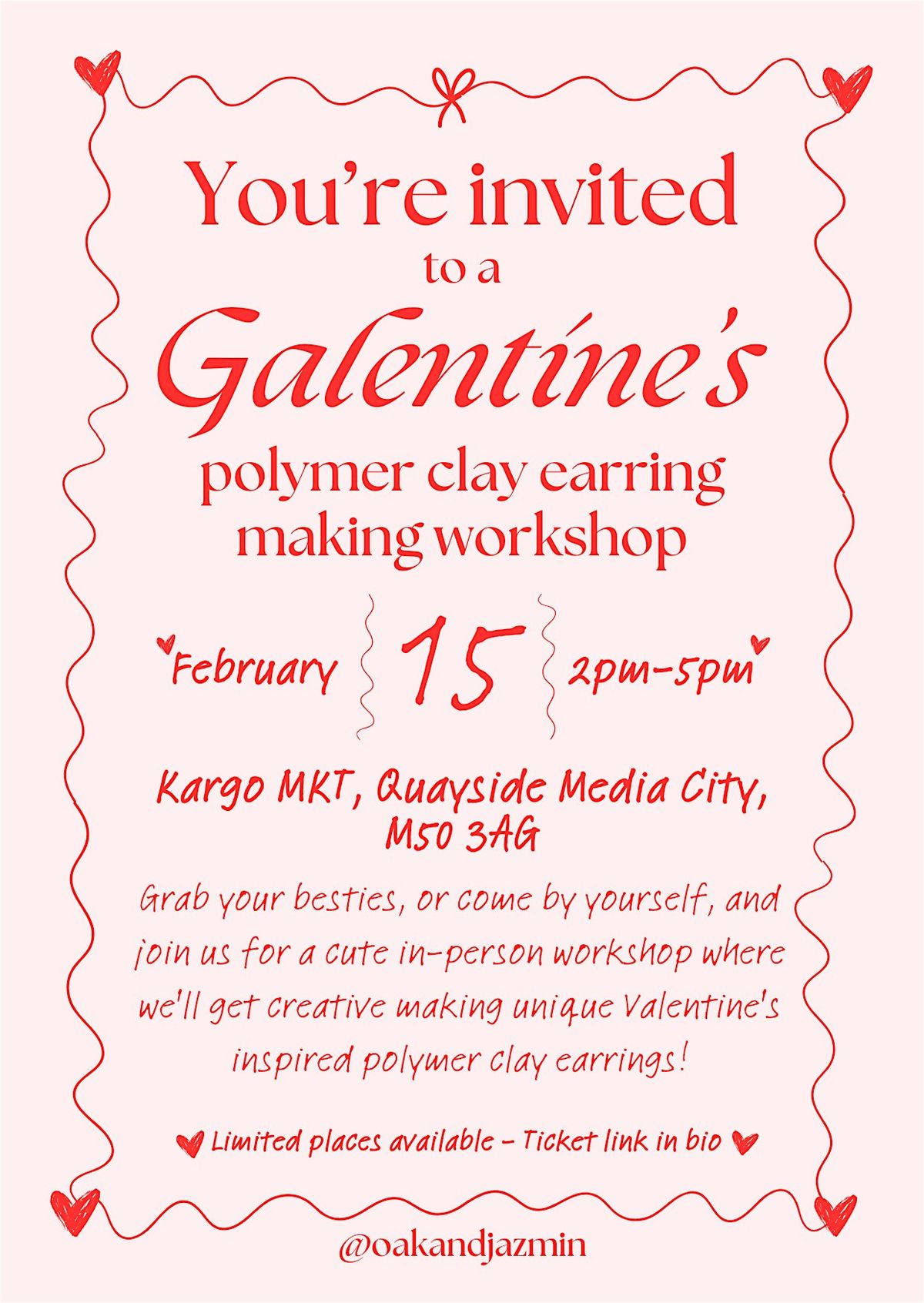 Grab your besties, or come by yourself, and join us for a fun-filled in-person workshop where we'll get creative making unique Valentine's inspired polymer clay earrings! Whether you're a pro or a newbie, come hang out, learn cool techniques, and craft some adorable earrings to rock or gift. Good vibes, laughter, and plenty of clay await — let's celebrate friendship this Valentine's and creativity together! 🥰