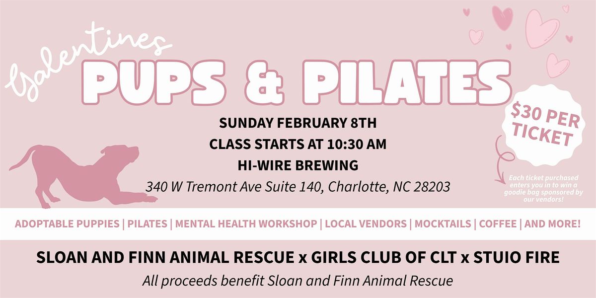 Galentines: Pups, & Pilates is a feel-good community event hosted by Sloan & Finn Animal Rescue, Girls Club of Charlotte, and Studio Fire, combining movement, mental health, local vendors, and adoptable dogs, all for a great cause.