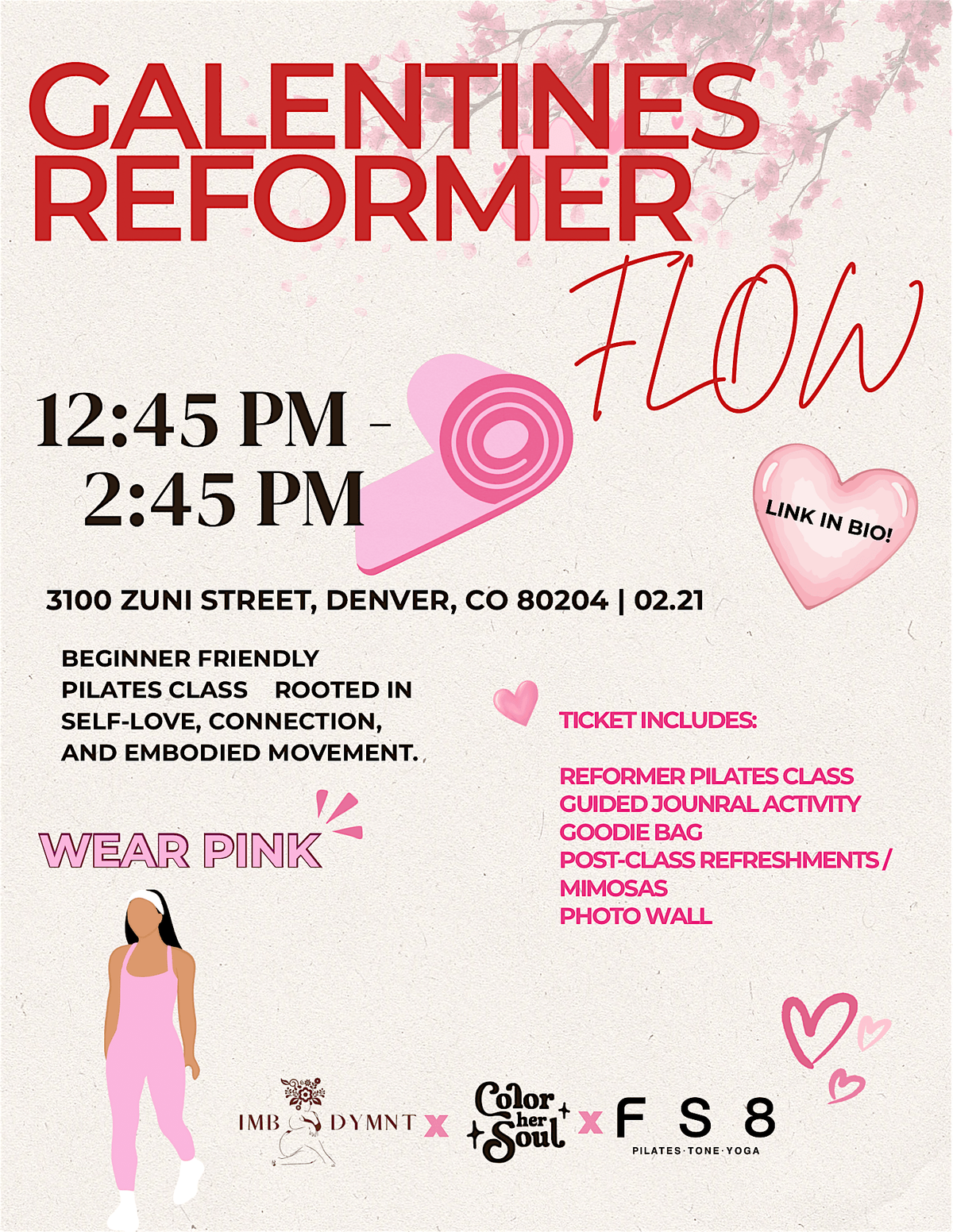 Join IMBODYMNT x Color Her Soulx FS8 for a Galentine’s Pilates Brunch rooted in self-love, presence, and community. This beginner-friendly reformer Pilates experience is an invitation to move intentionally, connect deeply, and honor your body exactly as it is—right now.