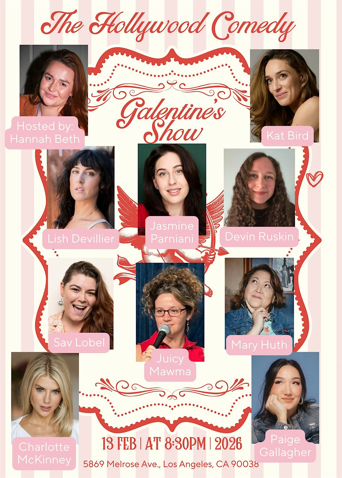 Welcome to ** A SPECIAL GALENTINE'S COMEDY SHOW AT THE HOLLYWOOD COMEDY **! Get ready to laugh at this hilarious event happening at The Hollywood Comedy. Whether you need somewhere to bring your date or want to just hang out with your girlfriends. Join us on **Friday, February 13th, 2026** at **8:30** for a night full of incredible comedy performances by talented stand-up comedians (only women lineup)! Don't miss out on the chance to unwind and have a great time with friends or family. Ages 18+ admitted. Get ready for a night of unbeatable entertainment at The Green Room Comedy Cafe (just one door over from The Hollywood Comedy)! See you there!