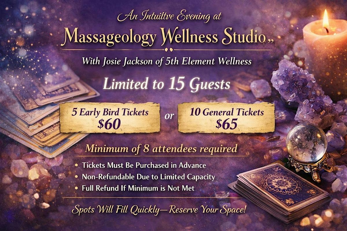 We’re bringing something special to Massageology Wellness Studio…Join us for an intimate Gallery Reading Experience, limited to just 15 guests, designed to help you relax, reset, and receive intuitive insight in a peaceful, supportive setting.The evening will begin with a guided meditation, followed by gallery-style readings led by intuitive practitioner Josie Jackson of 5th Element Wellness. Using a blend of tarot/oracle cards and intuitive channeling, Josie will share messages and insights with the group.While not every guest is guaranteed a personal reading, messages often resonate deeply across the group—creating a powerful and meaningful shared experience.Ticket Options:
