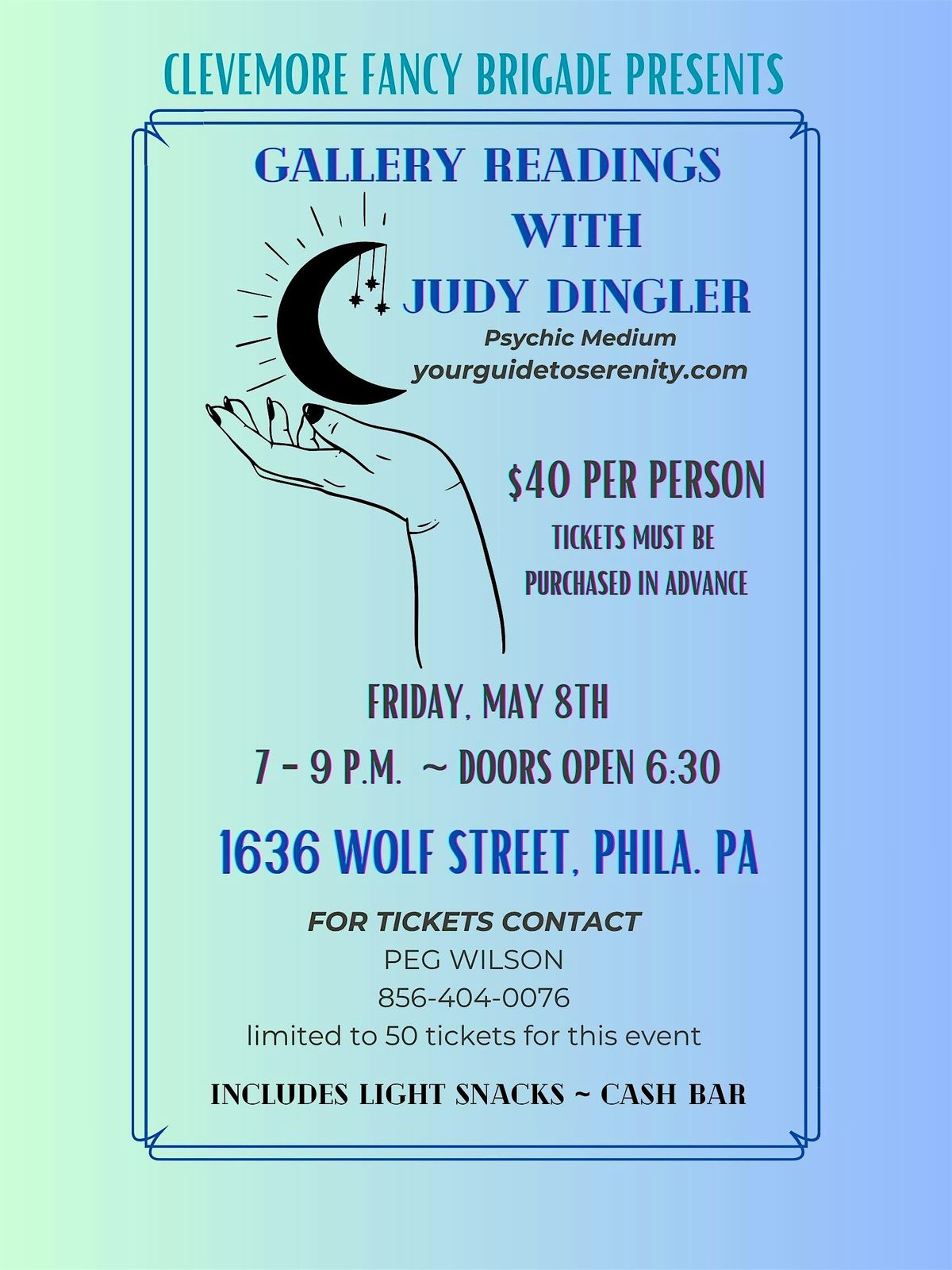 Come join us for an unforgettable evening of gallery readings with the talented Judy Dingler! This in-person event will be held at 1636 Wolf St. Get ready to connect with your loved ones on the other side and receive messages of love and healing. Judy's gift of mediumship is truly remarkable, and you won't want to miss this opportunity to experience it firsthand. Bring an open heart and mind, and prepare for an evening that will leave you feeling uplifted and inspired. See you there!
