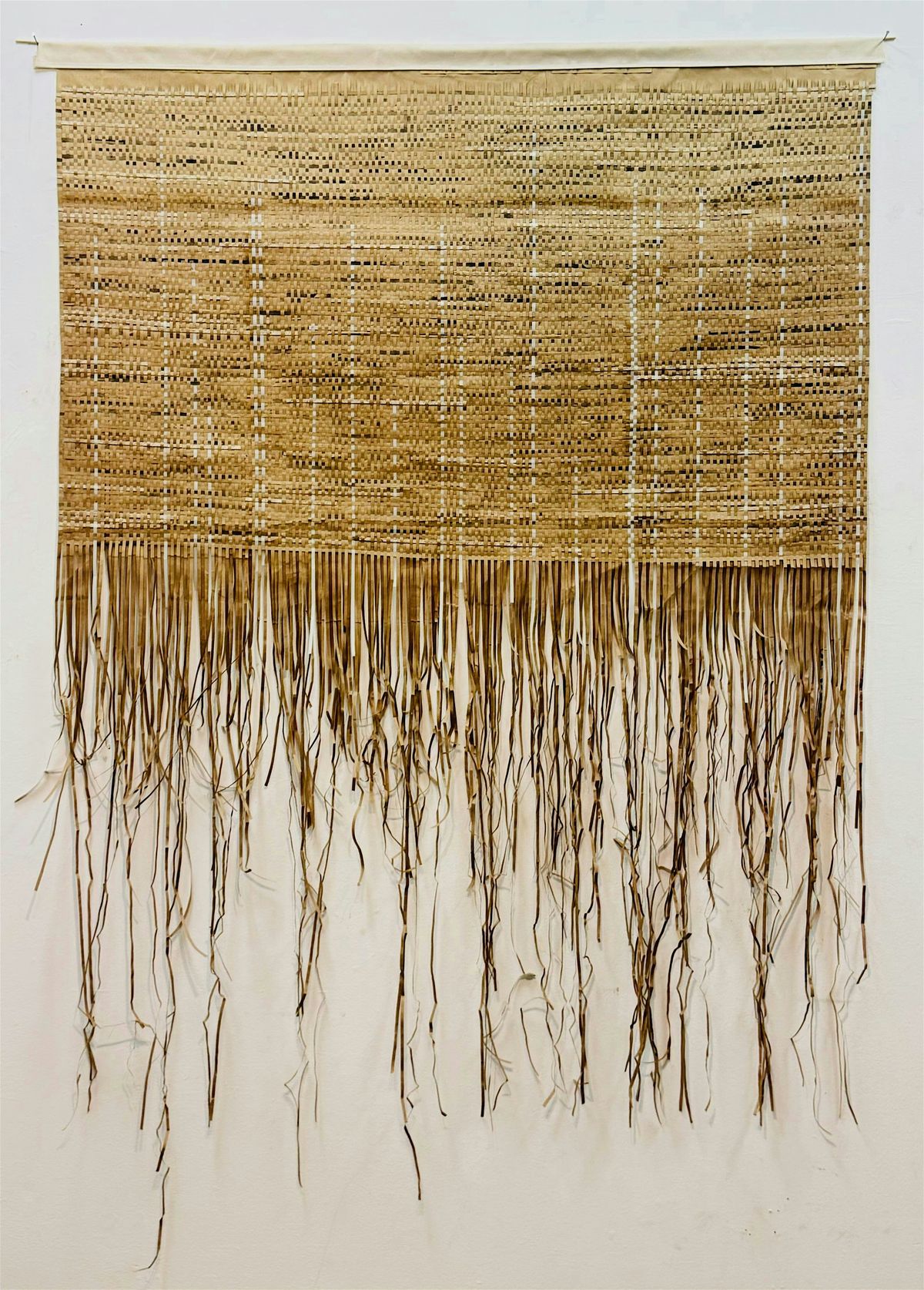 Image: Kelvin He Hao Low, Untitled, 2026. Woven paper from upcycled grocery paper bags with Indian ink, donated mylar film, and artist-made mulberry paper, 96 x 57 inches. Courtesy of the artist.