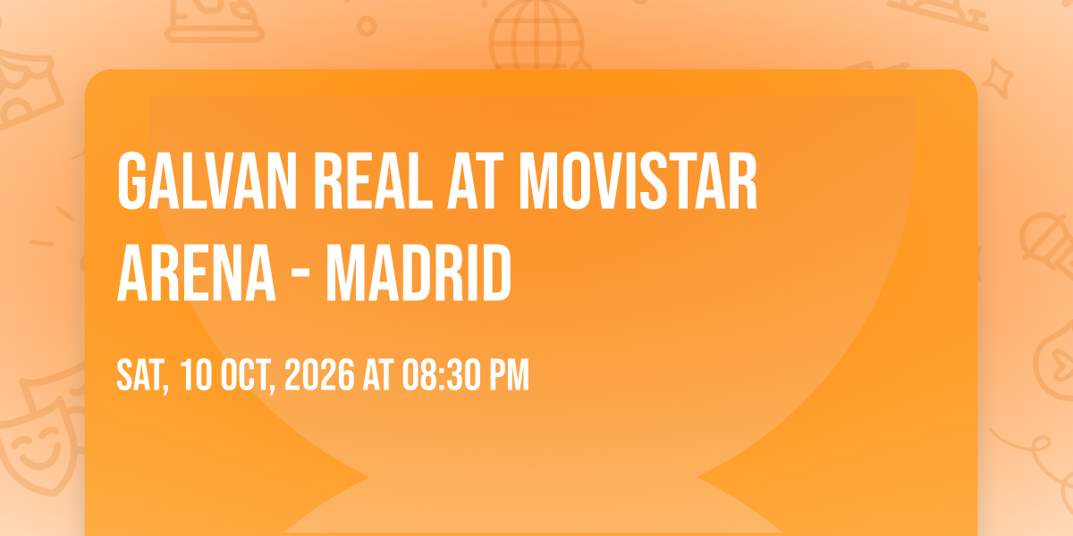 🎉 Welcome to Galvan Real at Movistar Arena - Madrid, where dreams come alive and possibilities are endless! 🏛️ Join us at Movistar Arena - Madrid in the heart of Madrid, MD for an event that defies expectations. 📅 On October 10th, 2026 at 08:30 PM, be part of something truly extraordinary as we bring together innovation, entertainment, and pure magic. ✨ Every aspect has been carefully designed to ensure an unforgettable experience for all our guests. Whether you're seeking adventure, inspiration, or simply a break from the ordinary, this event promises to deliver beyond your wildest dreams. 🎊 Prepare for a journey into the extraordinary!