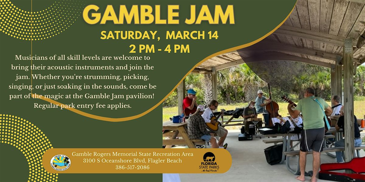 Join us for the Gamble Jam—a laid-back, toe-tappin’ tribute to the legendary Florida folk singer and storyteller, James Gamble Rogers IV! Musicians of all skill levels are welcome to bring their acoustic instruments and join the jam. Whether you’re strumming, picking, singing, or just soaking in the sounds, come be part of the magic at the Gamble Jam pavilion!
