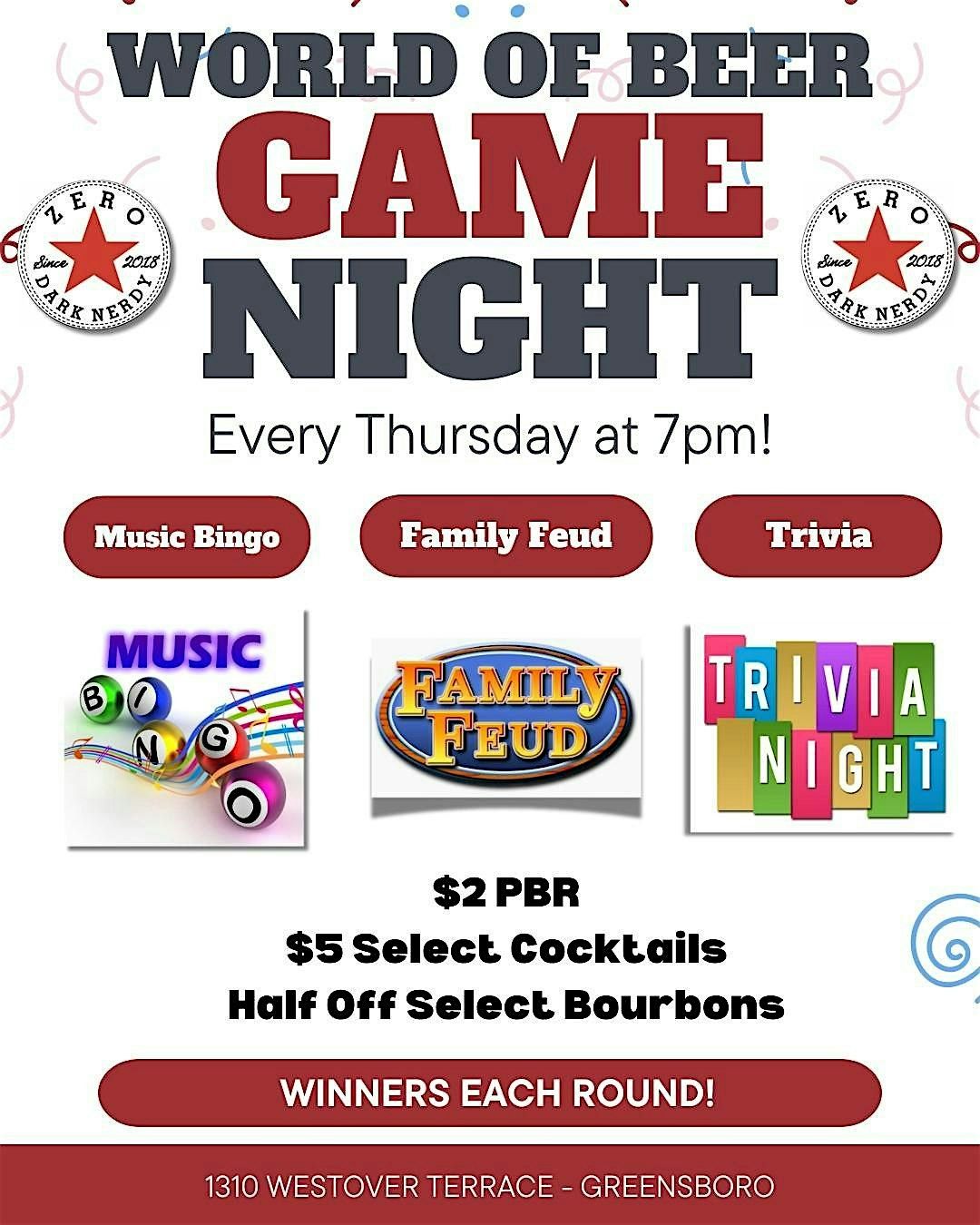 Join us for a fun-filled Game Night at World of Beer Greensboro, where you can enjoy games, drinks, and good company every Thursday at 7 pm! Family friendly with amazing food and drink specials. Rounds include Music Bingo, Family Feud, Which Came First, and Pop Culture Trivia.