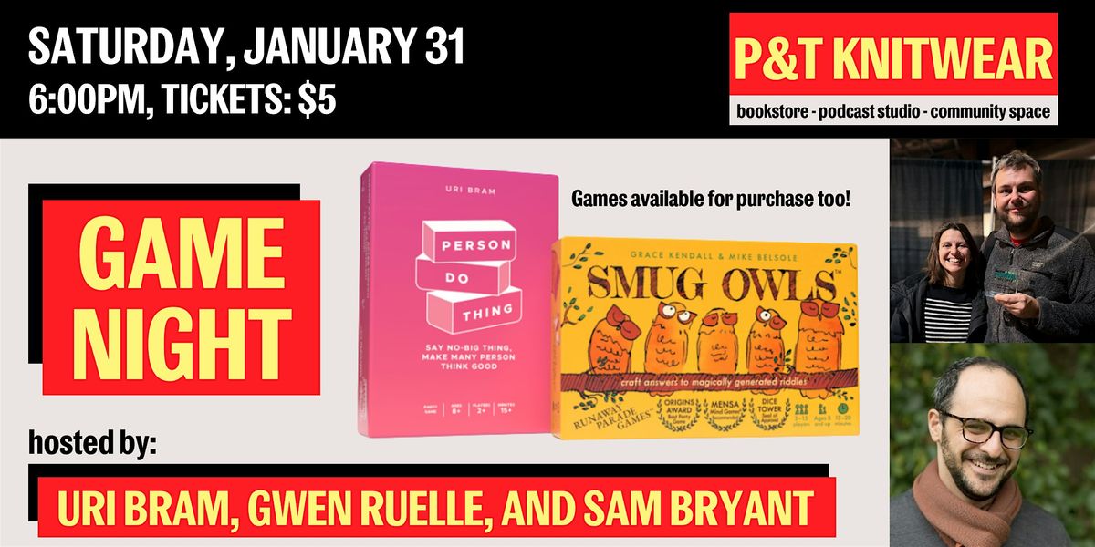 Join us on Saturday, January 31th for an evening of fast, friendly boardgames: Smug Owls and Person Do Thing!