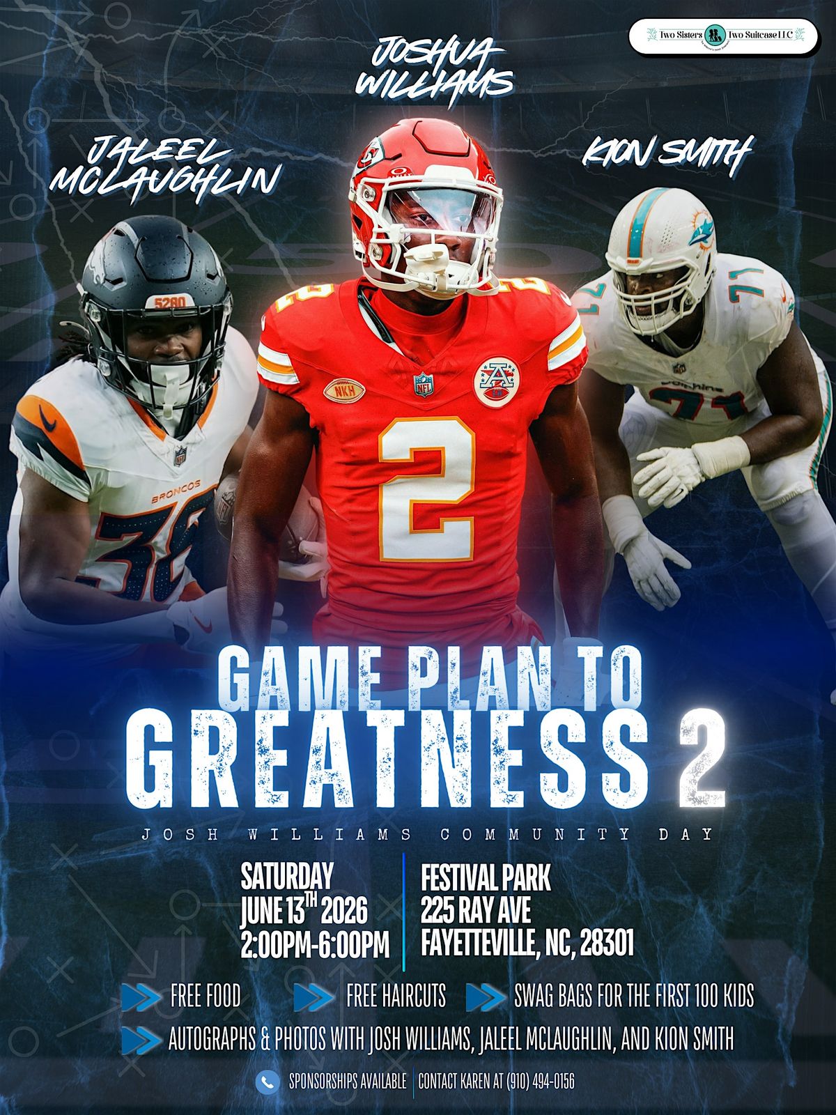 Join two-time Super Bowl cornerback champion Joshua Williams, along with running back Jaleel McLaughlin and guard Kion Smith, for an unforgettable Community Day in Fayetteville, NC! This event is designed for fans of all ages to come together for a day of fun, games, and giving back to the community.