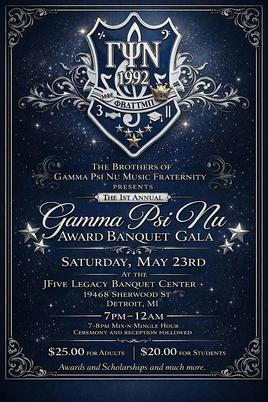 Join us for a fun evening at the JFive Legacy Banquet Center on May 23, 2026 at 7:00 PM (Eastern Time). Celebrate achievements, enjoy great company, and make memories at the Gamma Psi Nu Award Banquet Gala. Don’t miss out on this special night filled with laughter and recognition!