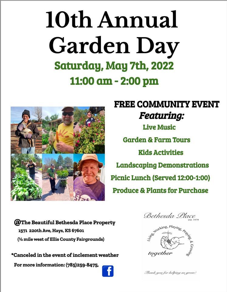 Bethesda Place Invites Community to 10th Annual Garden DayHays, Ks – Bethesda Place invites the community to a fun filled FREE family day in their gardens ½ mile west of Hays. From 11:00 a.m. to 2:00 p.m. on Saturday, May 7th the community is invited to join the men and staff of Bethesda Place strolling the gardens. Leisurely sip tea and visit with friends while enjoying live music, or participate in a scavenger hunt or educational landscaping tours. This is an opportunity for families to celebrate how gardens and love grow… slowly and with great care! Bethesda Place wants to take the opportunity to thank the community for “helping us grow!” throughout these many years.