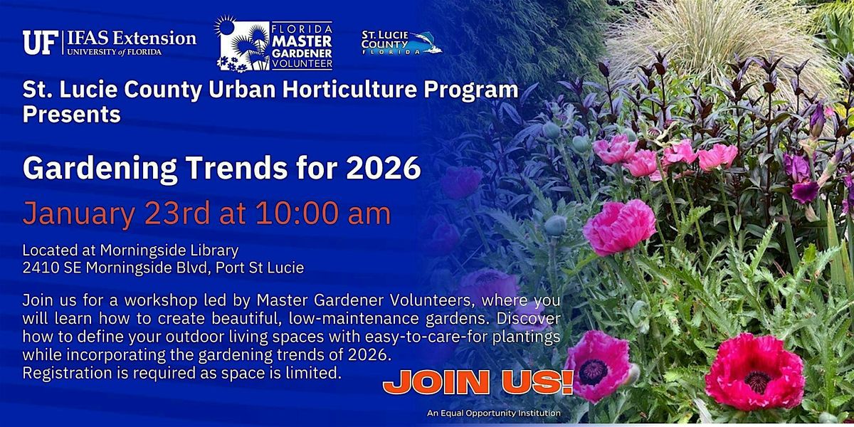 Join us for this free workshop lead by St. Lucie County Master Gardener Volunteer, Karen Cartmill as she helps you learn how to create beautiful, low maintenance gardens. Discover how to define your outdoor garden spaces with easy to care for lants while incorporating the gardening trends for 2026