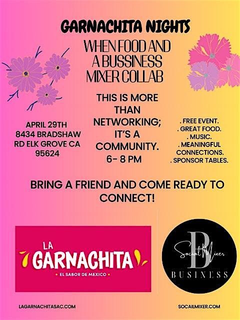 Enjoy delicious Garnacha-style food from Southern Mexico, music, sponsor tables, and intentional networking with amazing professionals.