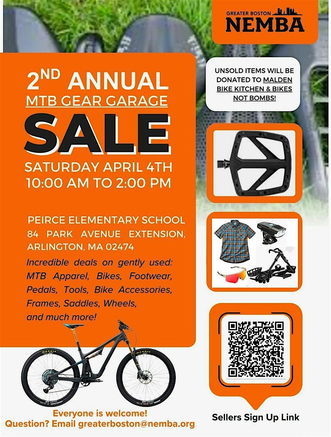 April 4 at 10AM at Peirce Elementary School in Arlington. Free and oopen to the public. Come check out a wide assortment of gentle-used MTB Gear. If you'd like to be a seller, reserve space here: https://forms.gle/WaoxE3EkU4vECJ926