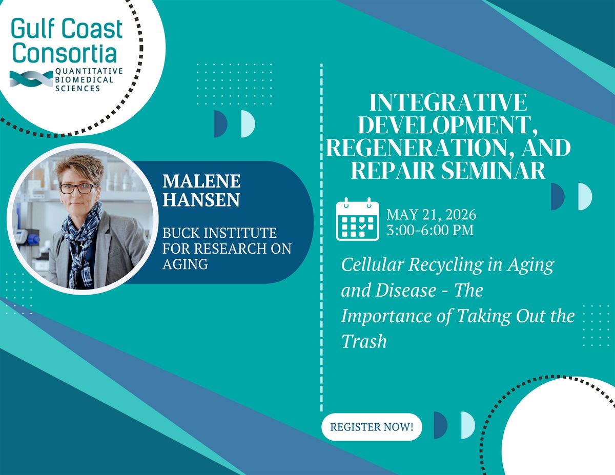 The GCC Integrative Development, Regeneration, and Repair group welcomes Malene Hansen from the Buck Institute, who will discuss Cellular Recycling in Aging and Disease: The Importance of Taking Out the Trash. The seminar will take place at the Bioscience Research Collaborative, 6500 Main St., Houston, TX 77030, Room 1003, on May 21, 2026, from 3-6 pm (CT). A Q&A session and reception will follow the presentation.
