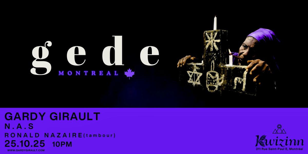 Entrez dans l’esprit du Gede au Kwizinn Vieux-Montréal durant la fin de semaine Halloween. Rejoignez-nous pour une soirée puissante avec Gardy Girault, NAS et des percussions live de Ronald Nazaire, alors que nous honorons les traditions ancestrales haïtiennes à travers la musique, la danse et le rythme. Une célébration de la vie, de la mémoire et du lien—plus qu’une fête, une véritable expérience.