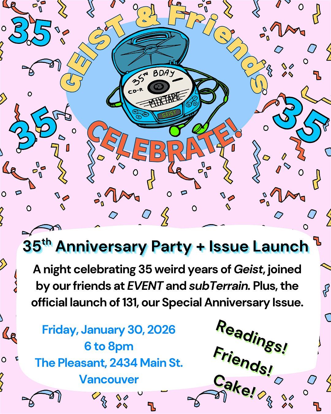 is 35! Celebrate with Geist and our wonderful friends at Magazine and Magazine for a night of 90s nostalgia, literature, and cake. Entwined with our birthday is the official launch of 131, our Special Anniversary Issue.