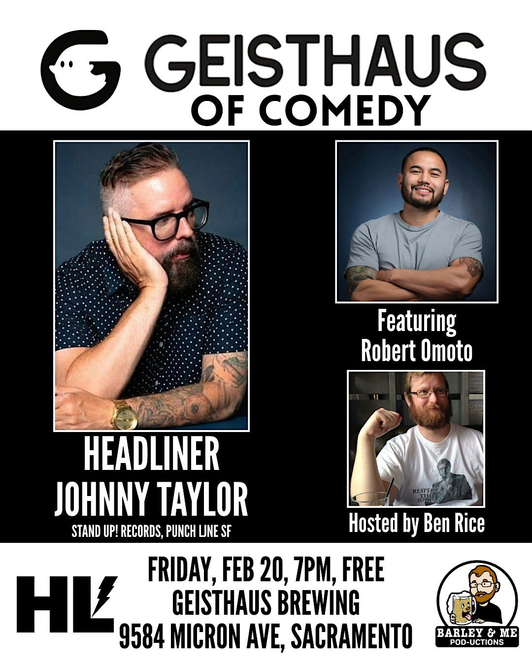 Headliner Johnny Taylor (Stand Up! Records, SF Sketchfest, Punch Line), featuring Sacramento's Robert Omoto (Laughs Unlimited). Hosted by Ben Rice. Presented by Barley & Me Pod-uctions & Hyper Live Events.