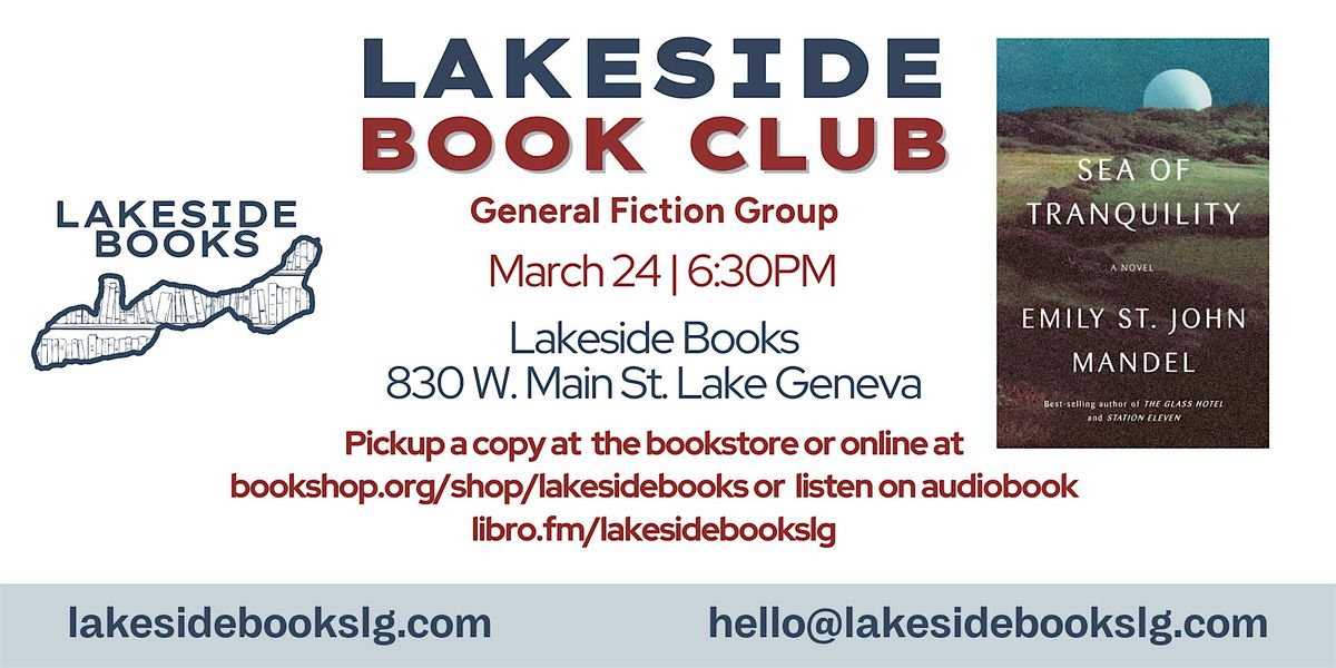 Our next book club read is Sea of Tranquility! Purchase books at the bookstore or online at bookshop.org/shop/lakesidebooks or listen on audiobook libro.fm/lakesidebookslg. Please RSVP so we have an accurate headcount. Please also join our Facebook Group for updates.