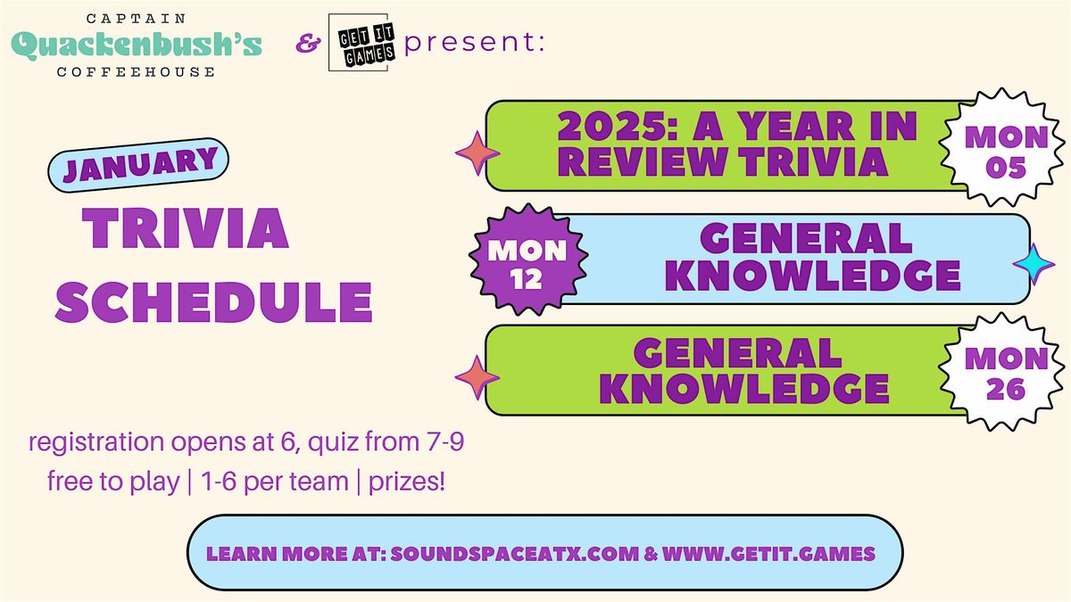 Come join us at Captain Quackenbush's Coffeehouse for a fun-filled evening of trivia! Test your knowledge on all things while enjoying delicious coffee, snacks and cocktails! Gather your friends and form a team to compete against others for the title of trivia champions. See you there!