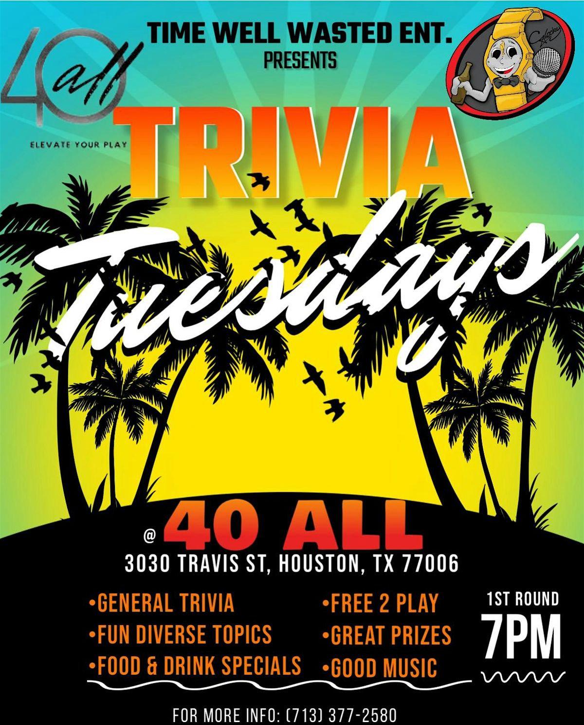 Come join us for a fun-filled evening of trivia at 40 All Midtown! Test your knowledge on a variety of topics and compete against other teams to win some awesome prizes. This in-person event is the perfect opportunity to show off your smarts and enjoy a night out with friends. Don't miss out on the chance to flex your brain muscles and have a great time! See you there!