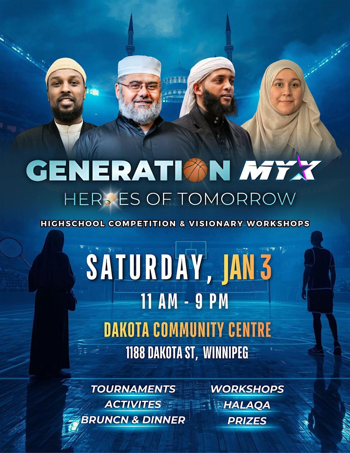 Join us on Saturday, January 3rd, 2026 from 11:00 AM to 9:00 PM at Dakota Community Centre for the official Grand Opening of MYX (Muslim Youth X) in Winnipeg. This full-day youth event is designed specifically for high school students (Grades 9–12), featuring competitive sports, motivational speakers, and self-development workshops aimed at building confidence, leadership, and strong character.